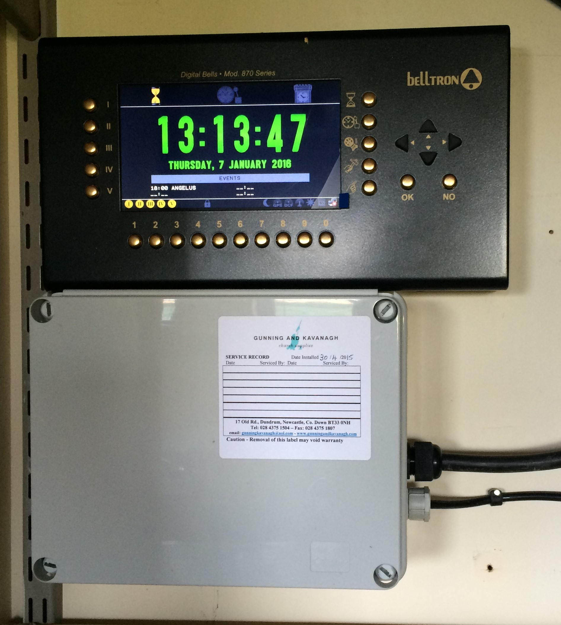 GM870 Cast Bell Control Panel with 7" graphic display. Capable of controlling up to 24 pealing or tolling bells. Tower clock movement. Programming by day in week / week in month / day in month / date / festive days / Easter / Christmas etc. Facility for service execution for the switching on/off other devices (ie heating, lighting etc.). Remote control and Belltron-Cloud options.